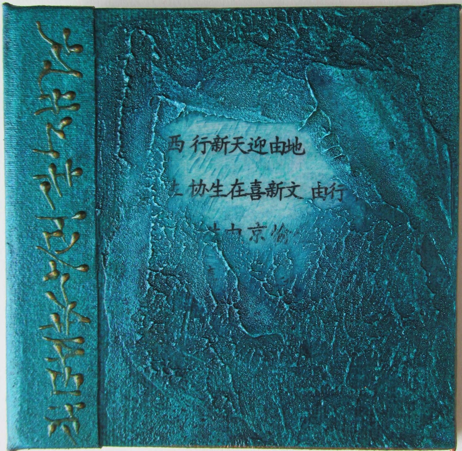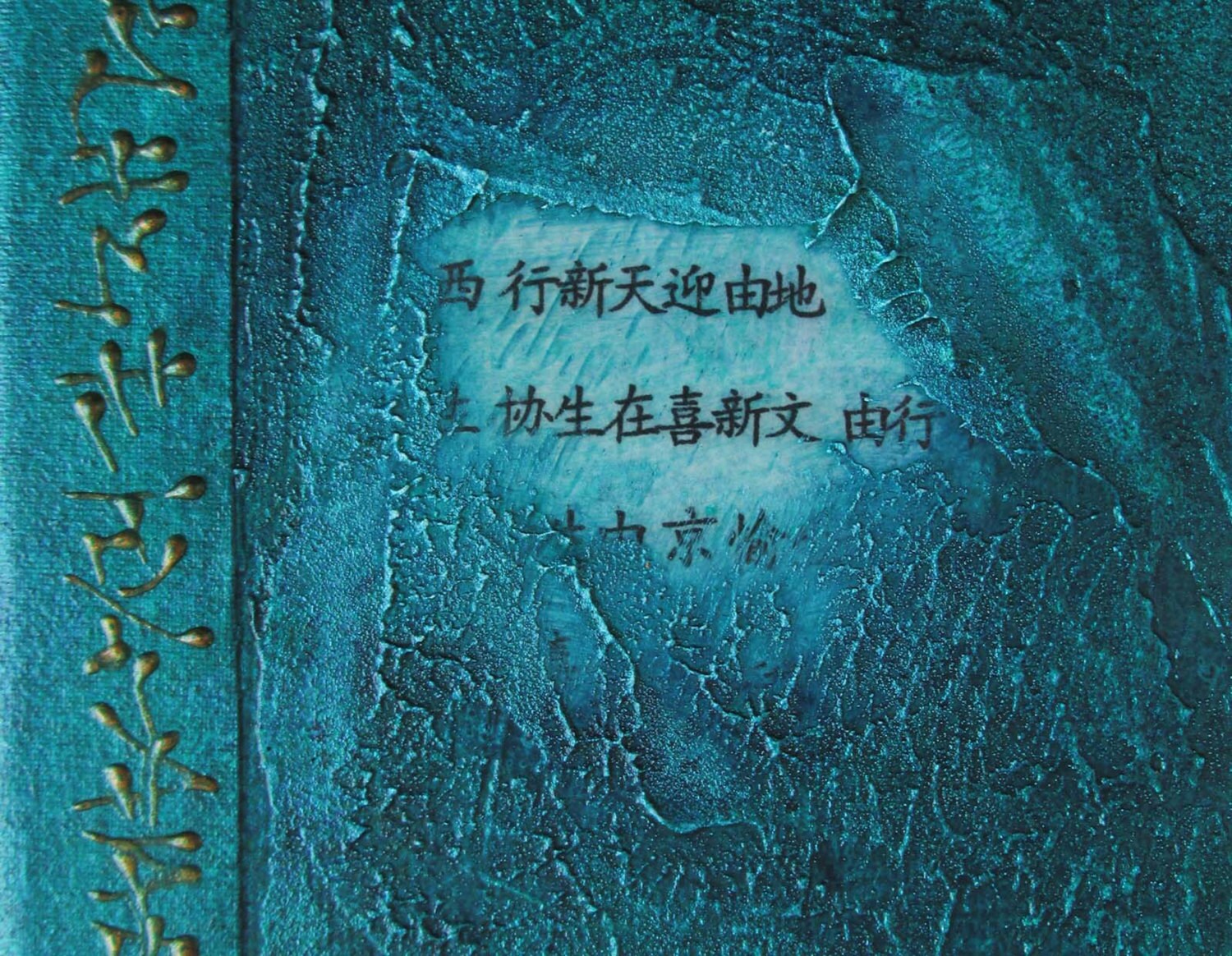 This journal has been decorated with handmade paper, collage and painted with acrylic paints. The inside covers have been glazed with copper paint and distressed.